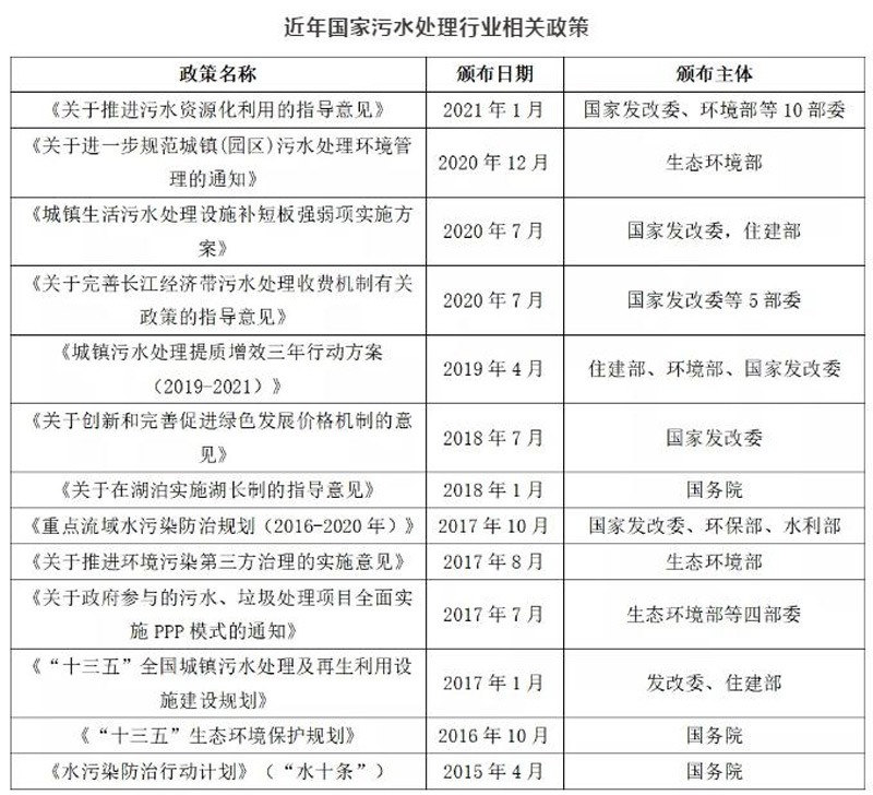 隨著我國(guó)經(jīng)濟(jì)不斷發(fā)展,生態(tài)問(wèn)題日漸凸顯,政府對(duì)環(huán)保問(wèn)題日趨重視,近年來(lái),國(guó)家出臺(tái)多項(xiàng)污水處理相關(guān)政策,涉及水污染防治、污水處理市場(chǎng)化機(jī)制等多方面內(nèi)容,推動(dòng)我國(guó)污水處理市場(chǎng)不斷規(guī)范化發(fā)展。